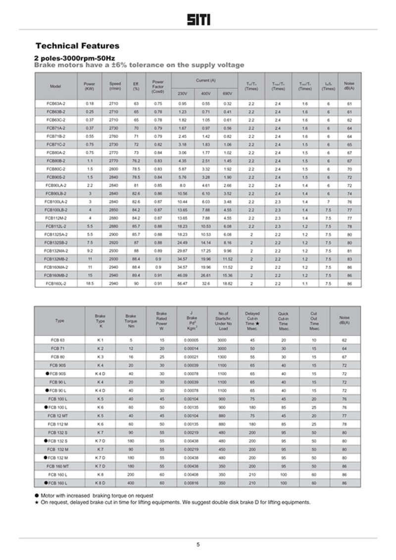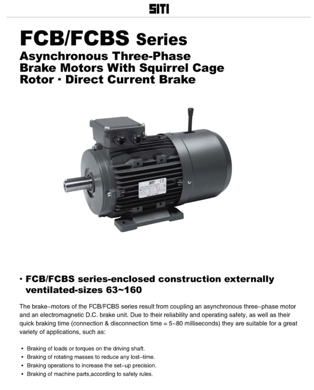 IEC標準的FCB電機遵循國際標準。功率在0.06-30KW范圍內,可地腳安裝,也可以B5或B14法蘭安裝。通常有單極和雙極電機,提供了三種制動形式,一種直流和兩種交流,所有電機均可用于變頻器控制。